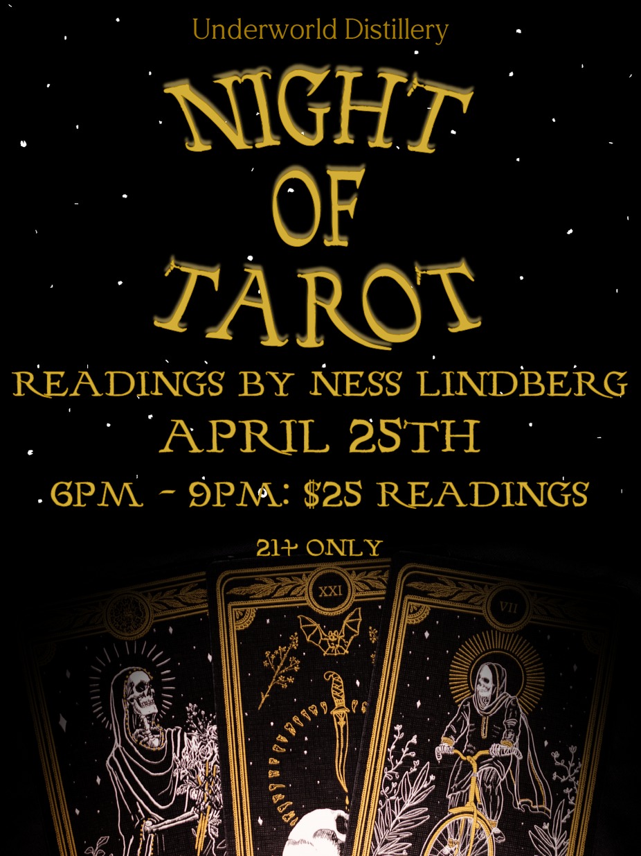 Saturday, April 25th, step into a night of intuition and indulgence at Night of Tarot with Ness Lindberg! She will be in the distillery from 6 PM to 9 PM offering $25 readings. Whether you're seeking guidance, curiosity, or just a little cosmic fun, pull up a chair and see what the cards have in store.