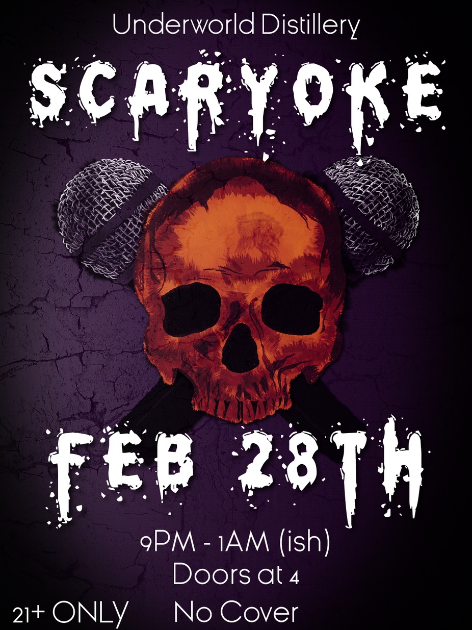 End the month right with Scaryoke (spooky karaoke) here at Underworld Distillery! Doors open at 4PM, but the party REALLY kicks off at 9PM! Bring a friend, family member, or just yourself! Jam out with us on February 28th.