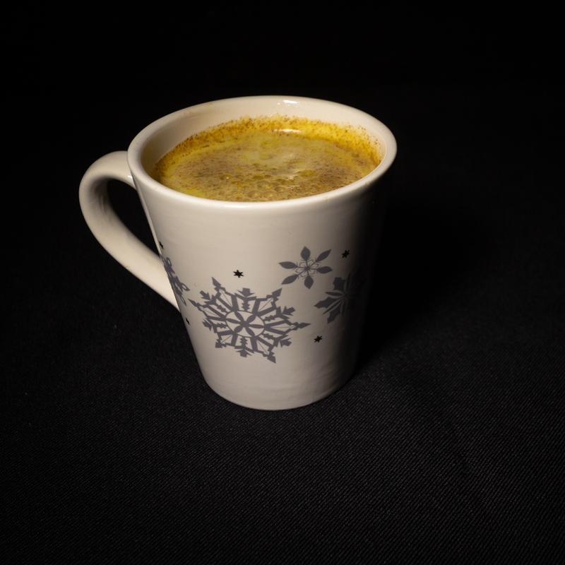 Vegan heavy cream, turmeric, black pepper, house-made ginger honey syrup, cinnamon, spiced chai, hot water